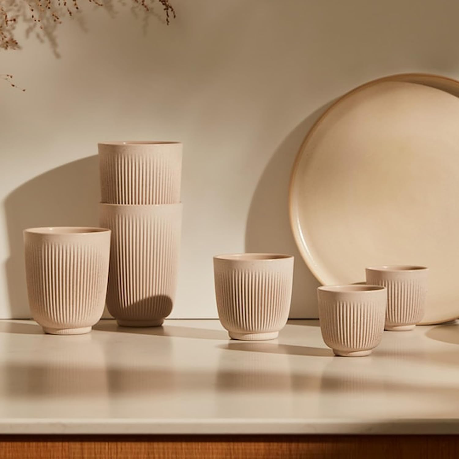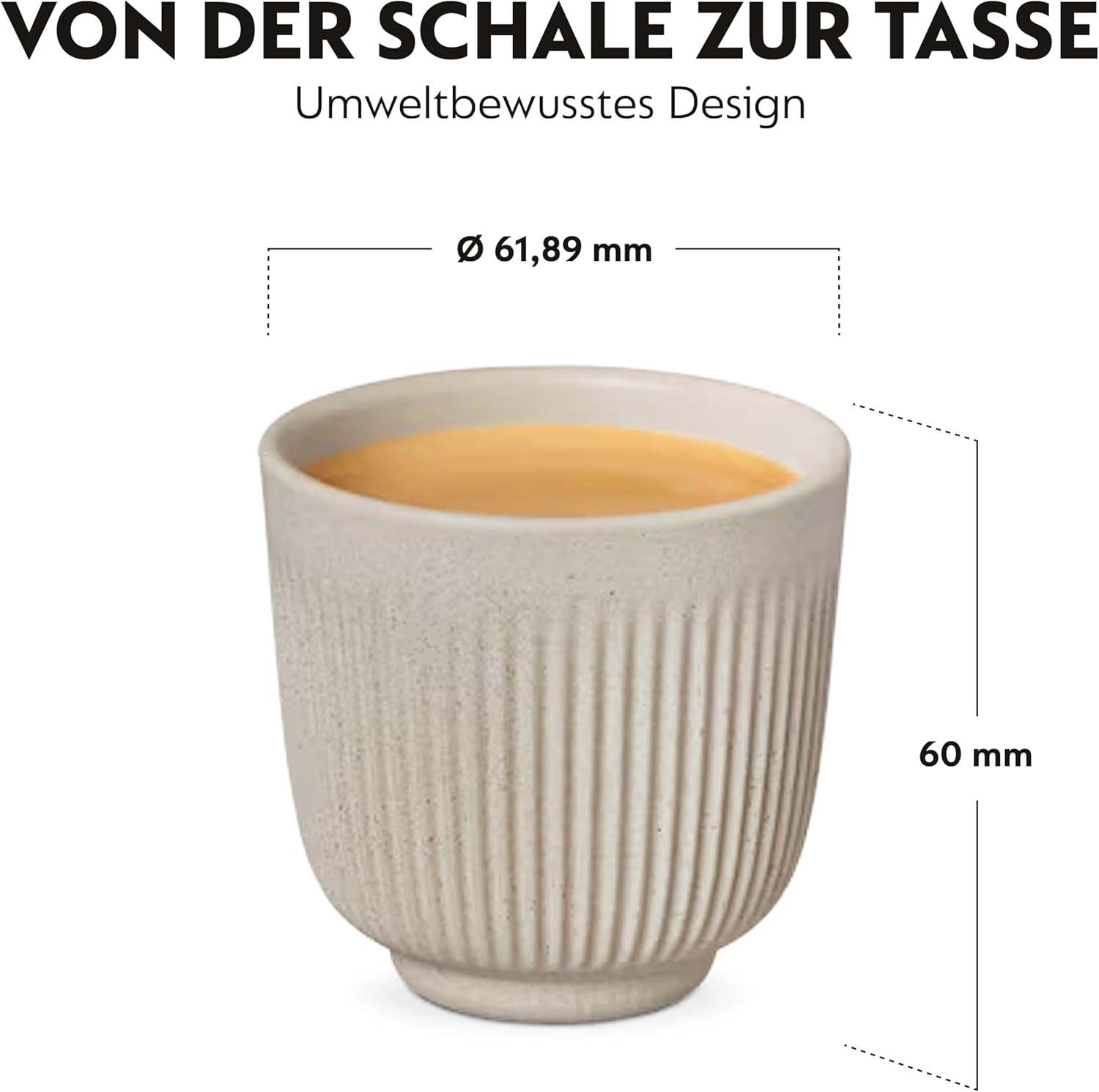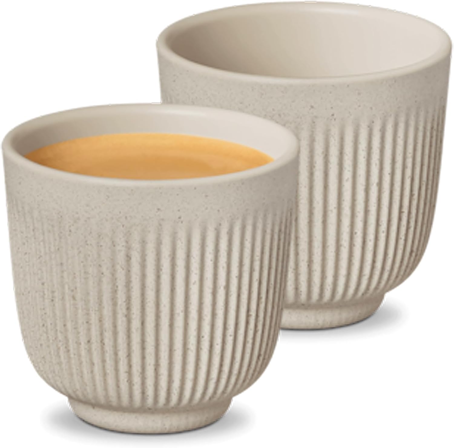 هر فنجان در این مجموعه دارای ظاهری گرد، لبههای نرم و دیوارههای ضخیم است تا گرمای اسپرسو برای مدت طولانیتری حفظ شود. طراحی بدون دسته با سطحی مات و خوشدست باعث میشود حس طبیعی و آرامشبخشی در تماس با فنجان ایجاد شود.